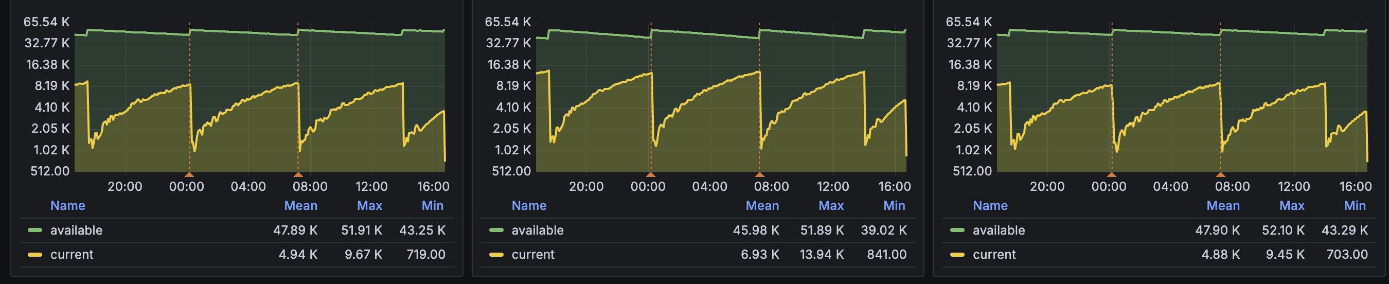 Over 8K connections are spawned before OOMKilled and the problem starts again. Connection summaries from PMM connected to cluster: