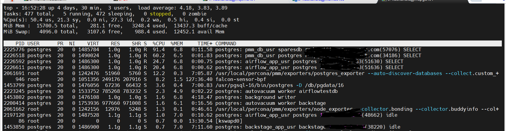 To continue the investigation, I’d suggest you to use those PIDs to see the exact query being executed. For instance, for the first client you showed, get the PID from the first top column and use it in a query like: